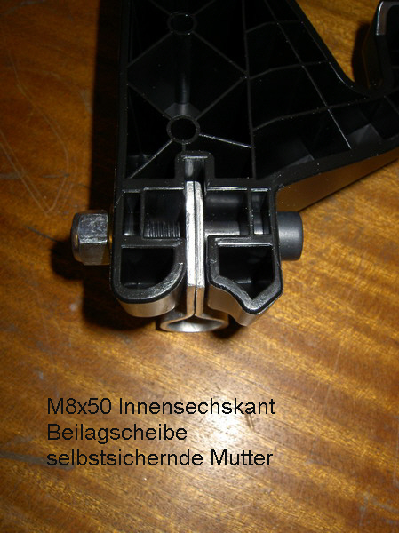 Als Schraube habe ich eine M8X50 Innensechskant verwendet. Eine Sechskant-Schraube geht auch. Dazu eine Beilagscheibe auf der Seite der selbst sichernden Mutter. Selbst sichernd deshalb, weil die Mutter nicht fest angezogen wird, weil sich sonst wahrscheinlich der Umklappschutz nur mehr sehr schwer bewegen lässt und der Kunststoffteil auch im original Einbau nicht geklemmt wird sondern nur von einem Stift in der originalen Befestigungslasche gehalten wird. Jede andere Mutter würde sich wieder runter schütteln? Preis: ? Die Teile bekommt man im Baumarkt um einige Cent.