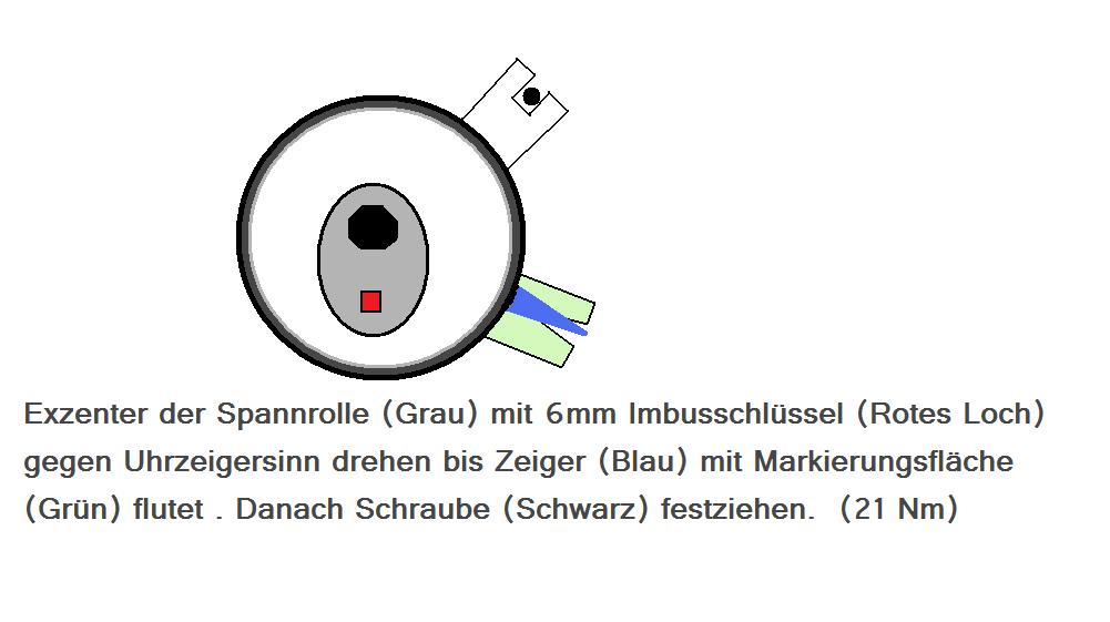 Zahnriemen auflegen und korrekt spannen (siehe Bild unten).
