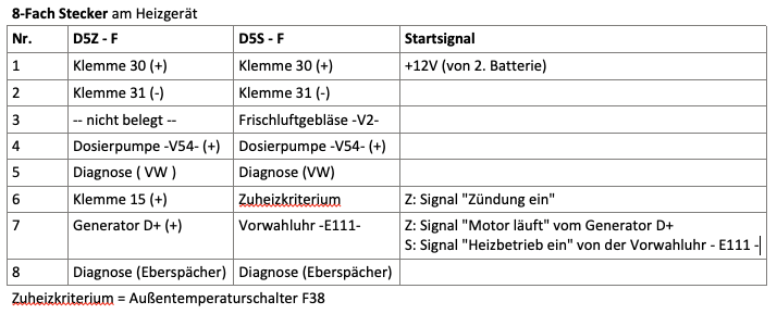 Der Tempearturschalter welcher auf Kontakt 6 geht muss von D+ und nicht mehr Kontakt 15 (Zündung) versorgt werden. Ansonsten startet der Zuheizer sobald man die Zündung einschaltet.